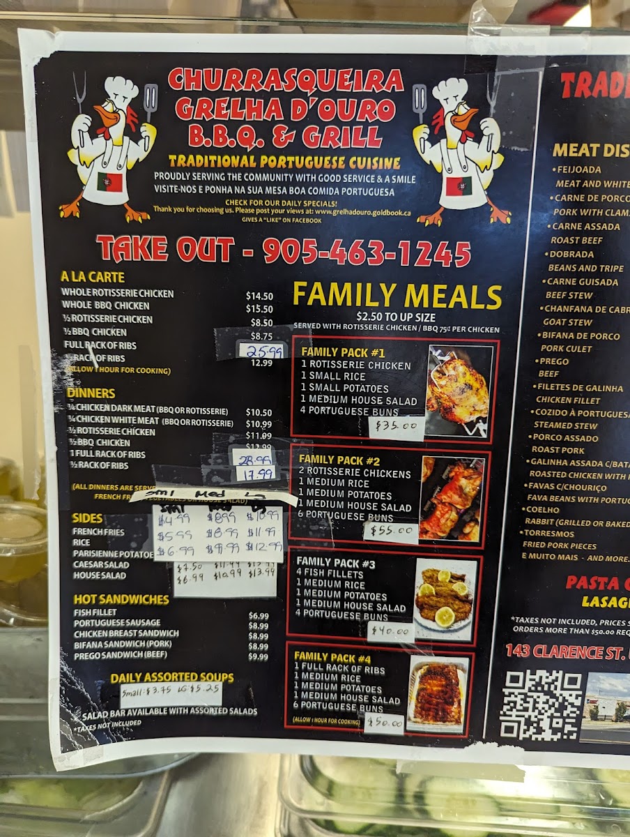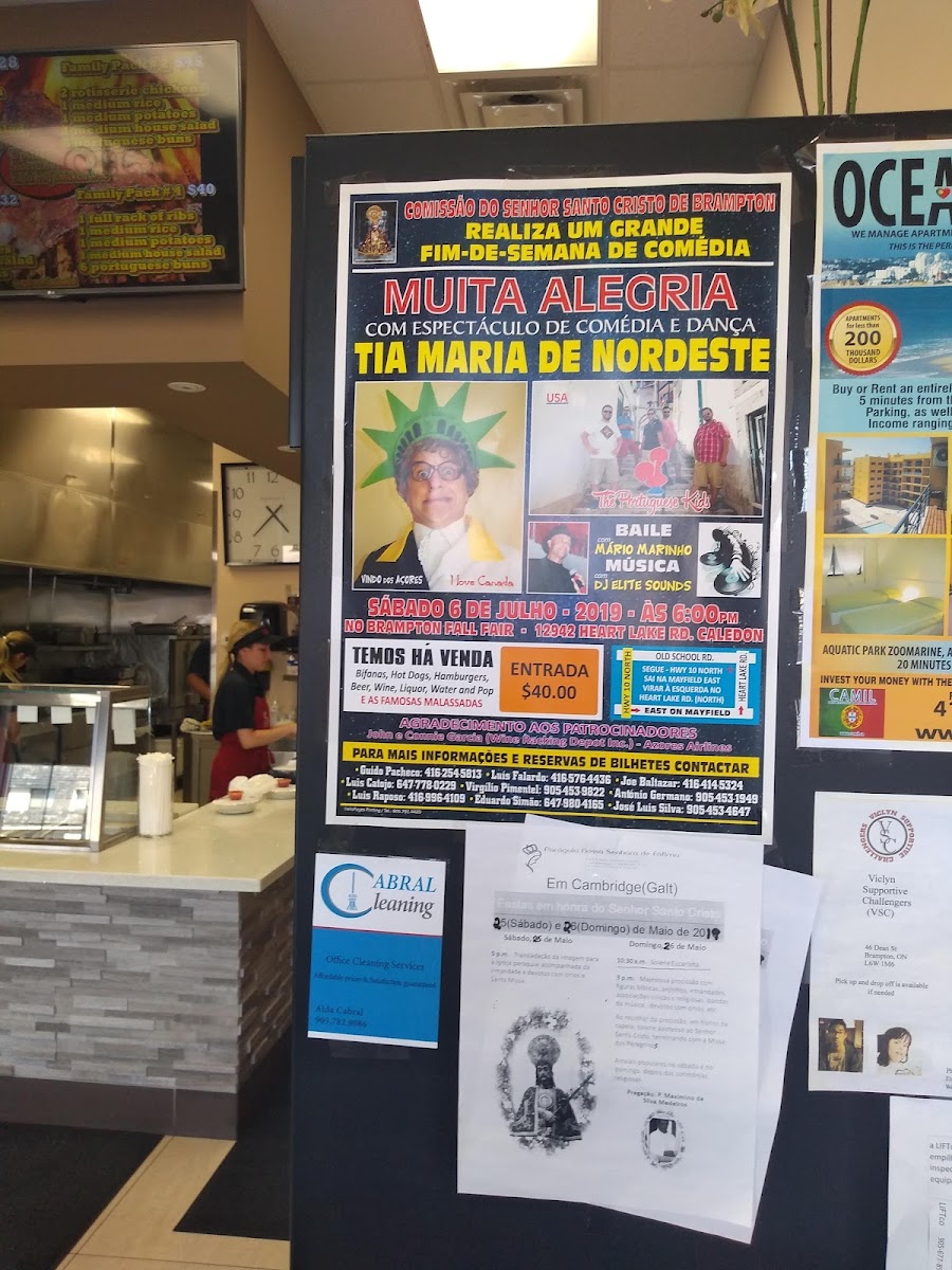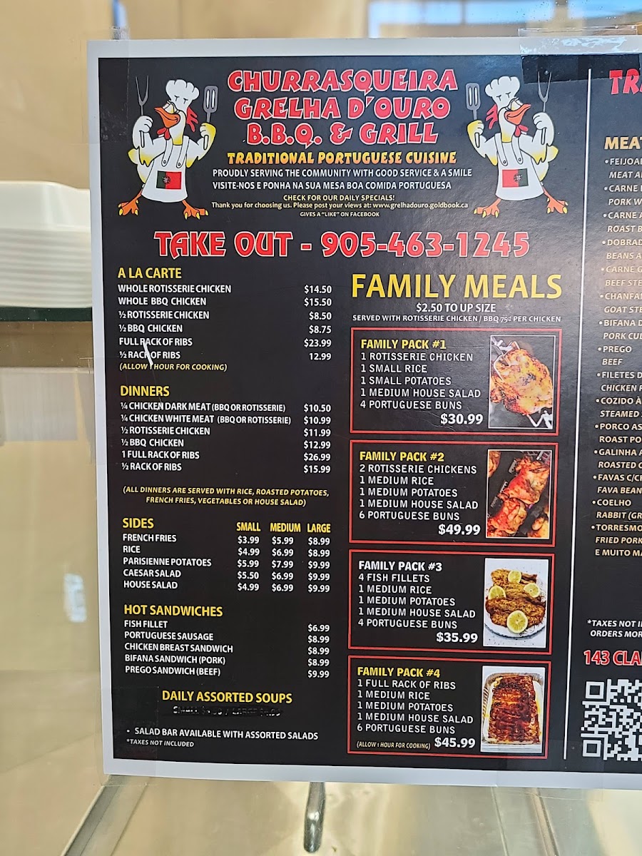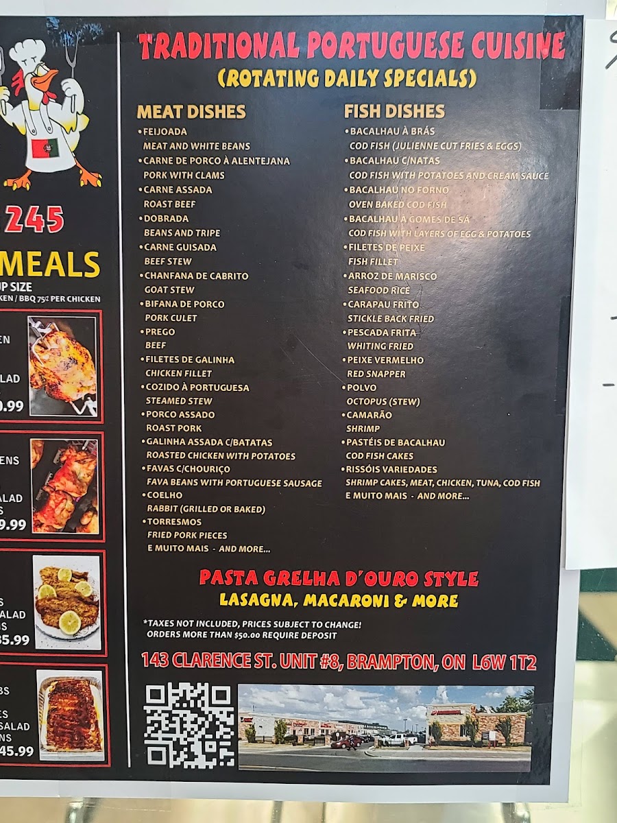 The menu features classic rotisserie options like BBQ chicken and ribs, alongside fresh seafood such as red snapper and crispy pastéis de bacalhau (codfish fritters). Complement these with simple, well-prepared sides like Parisienne potatoes, rice, or fresh salads that balance the rich, savory mains.